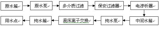 原水箱、原水箱、液位控制器、原水進水電磁閥、原水泵、多介質過濾器、管路、閥門、保安過濾器、電滲析器、中間水箱、中間水箱液位控制器、純水泵、混床離子交換器、純水箱、純水箱液位控制器、電導監督儀。